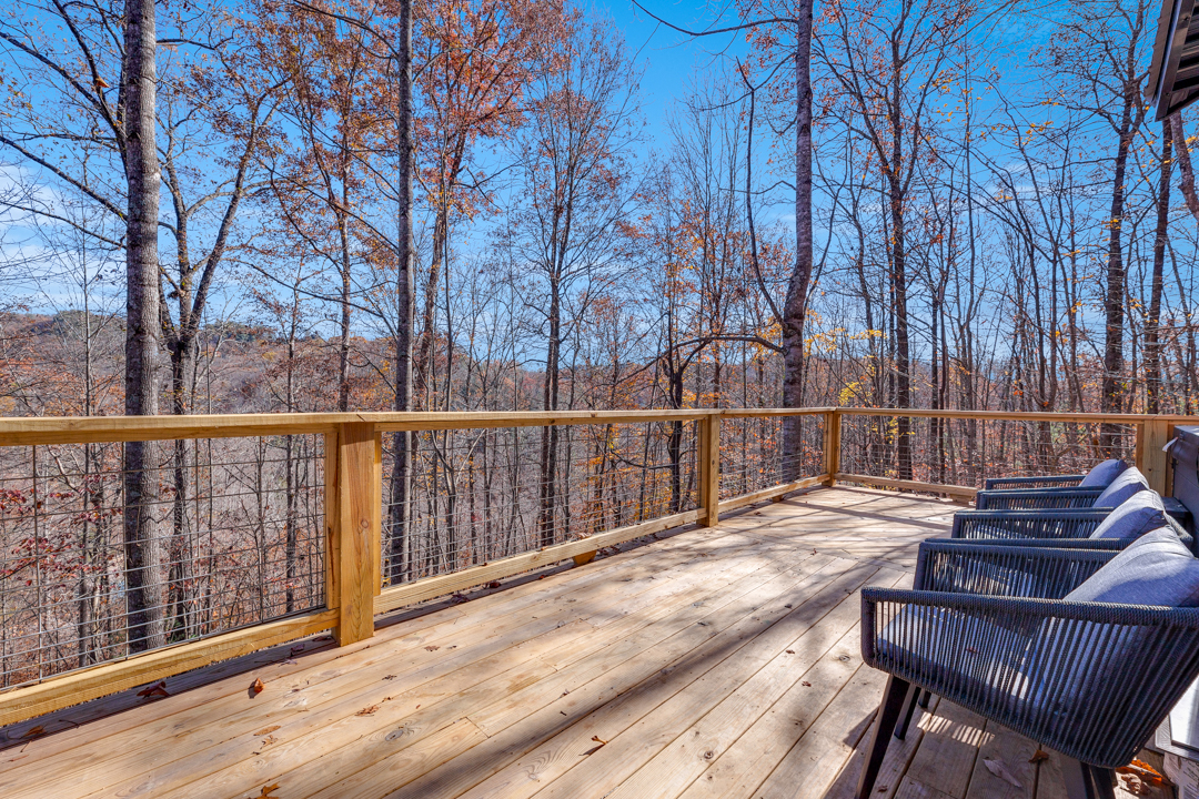 A large deck offers multiple outdoor living areas, including space for lounging, dining, and enjoying the surrounding forest views.