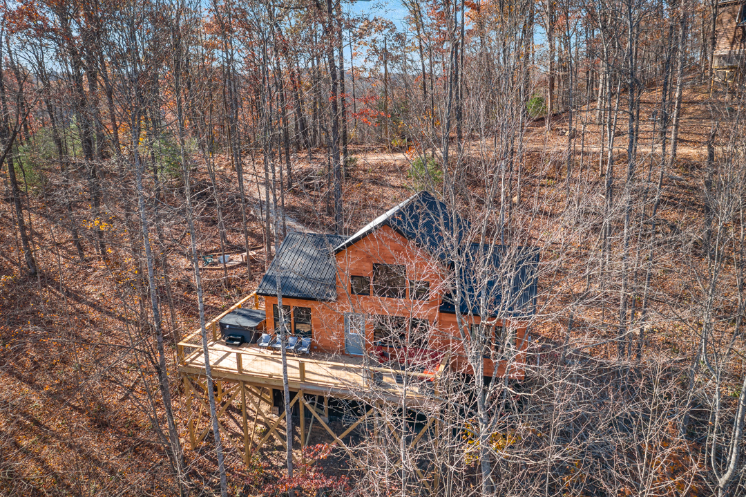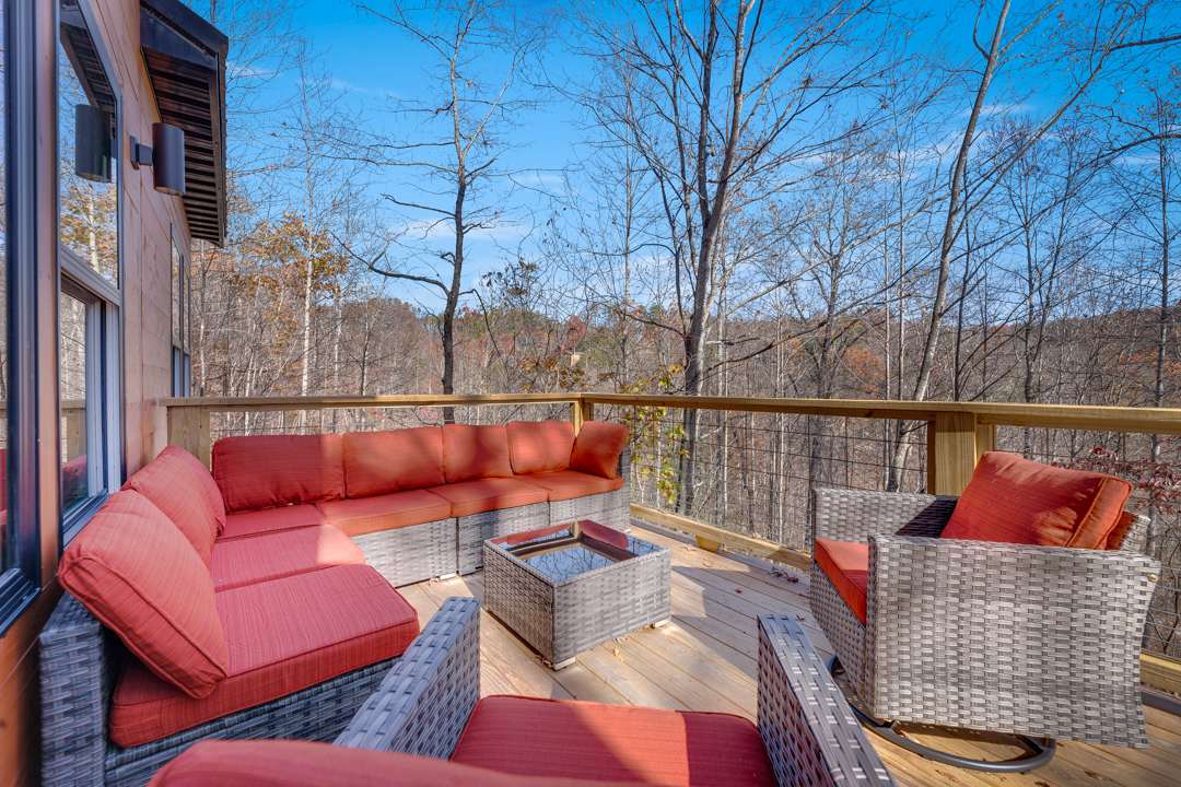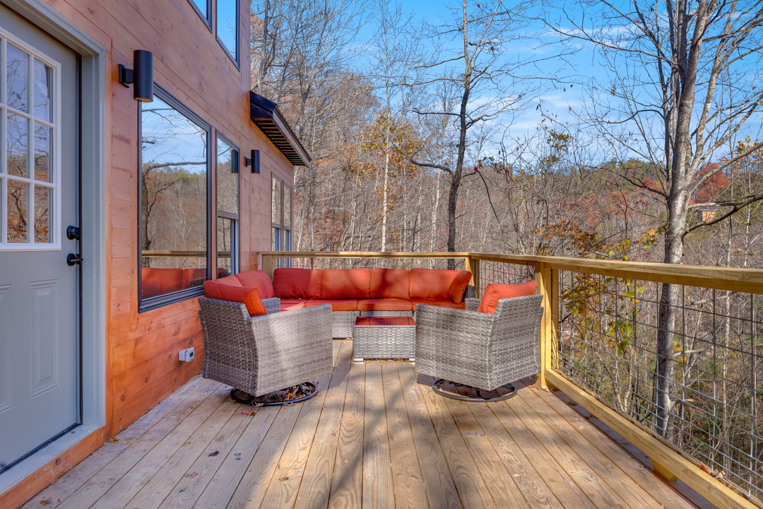 Skyward Chalet brings the best of Red River Gorge right to your doorstep. The expansive deck features a forest-view hot tub, a cozy lounge area, and a large outdoor dining table that seats six — perfect for slow mornings, sunset dinners, and nights under the stars.