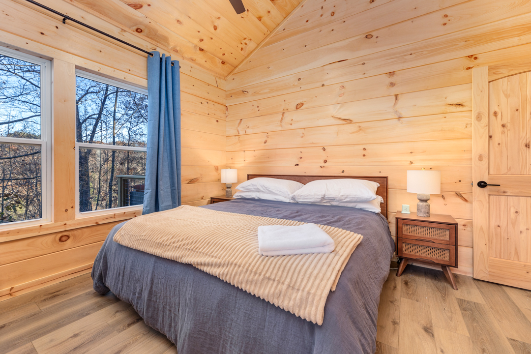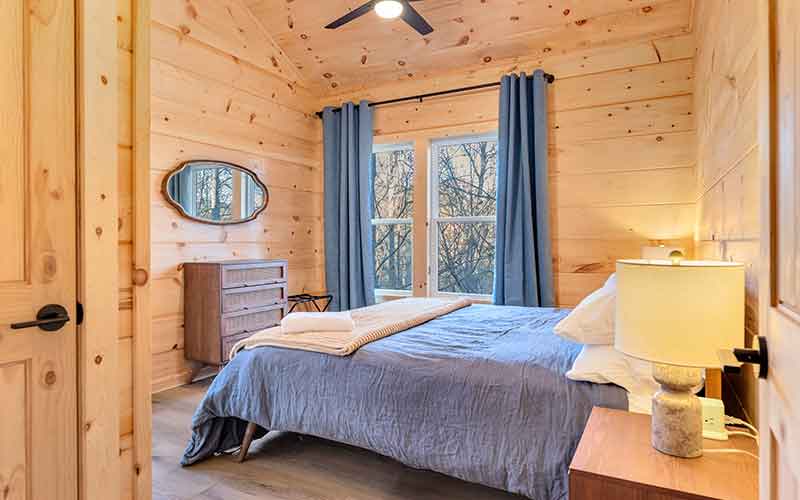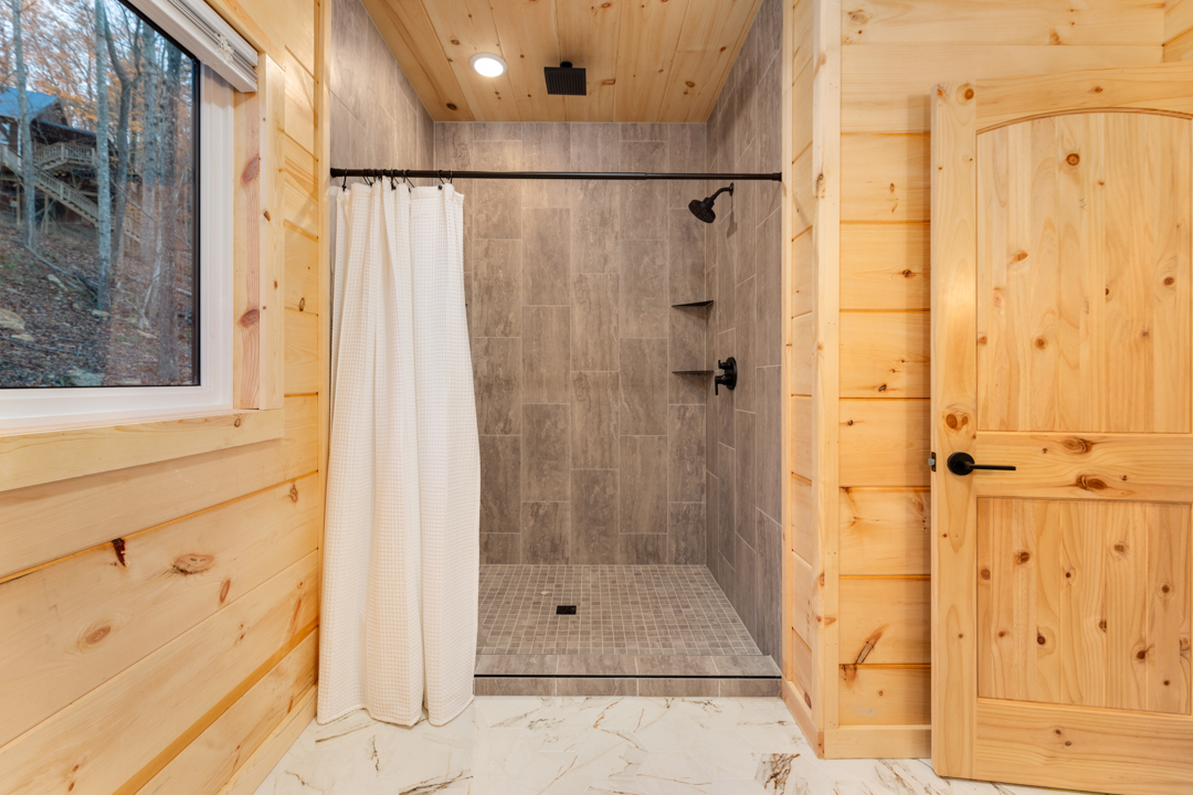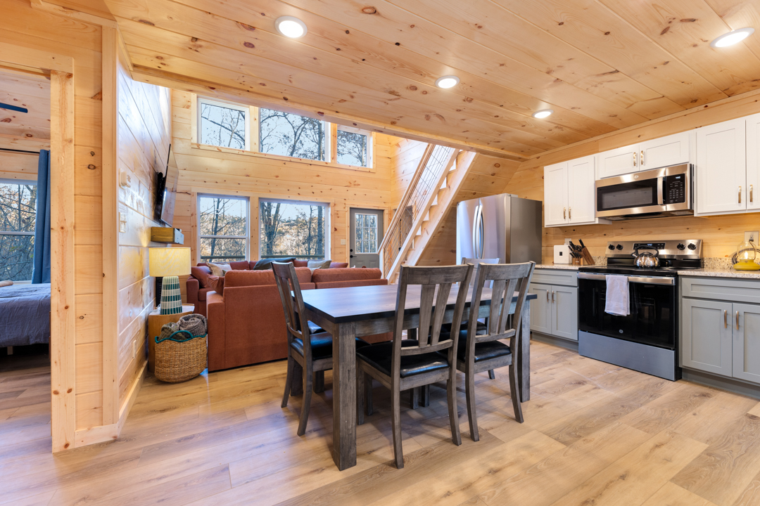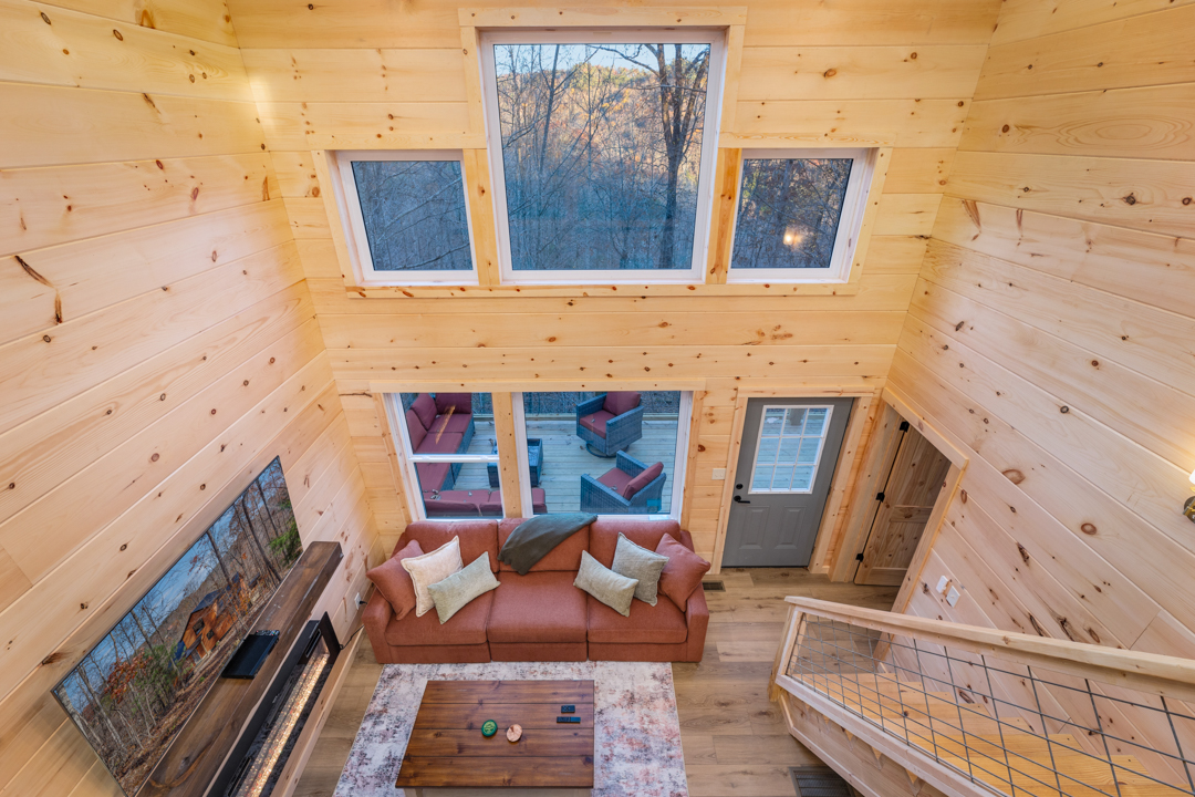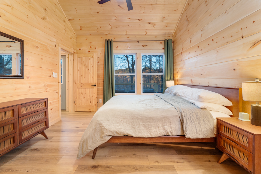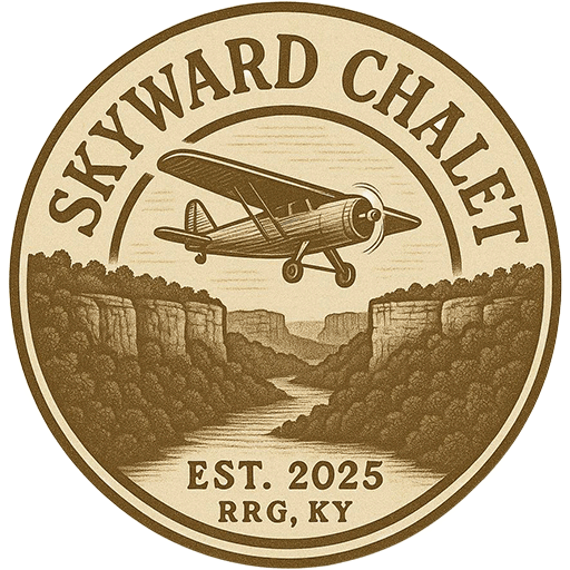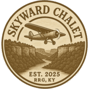 Skyward Chalet blends modern rustic style with the natural beauty of Red River Gorge. Inside, you’ll find warm wood finishes, aviation-inspired touches, and plenty of space to unwind. Both bedrooms feature king beds, the loft adds a cozy queen, and the main bathroom elevates your stay with a large tiled shower featuring both a standard and rainfall showerhead.