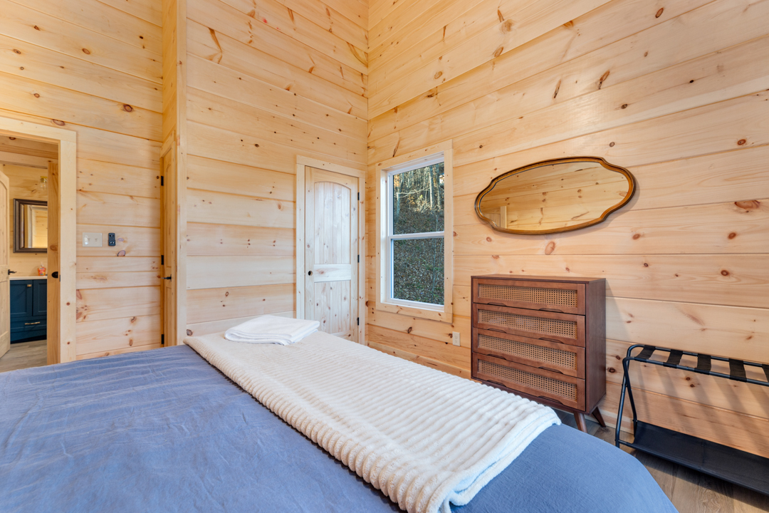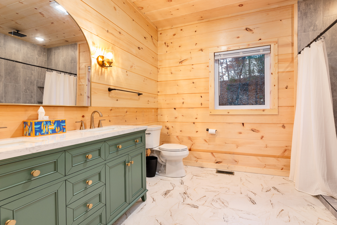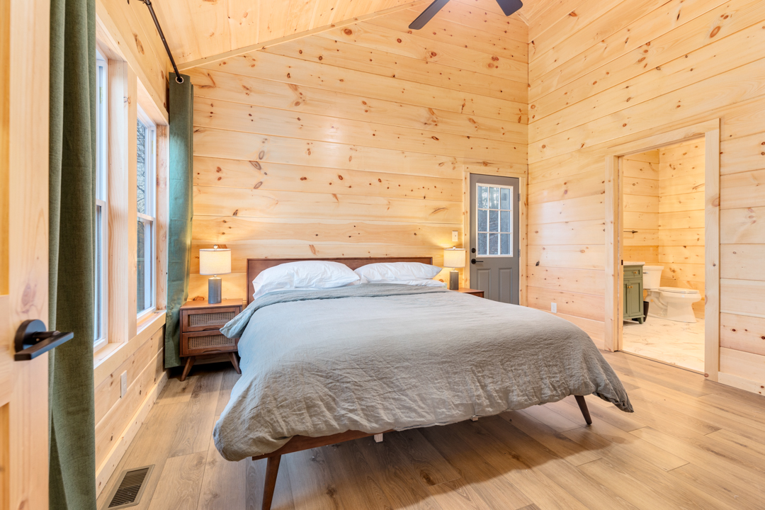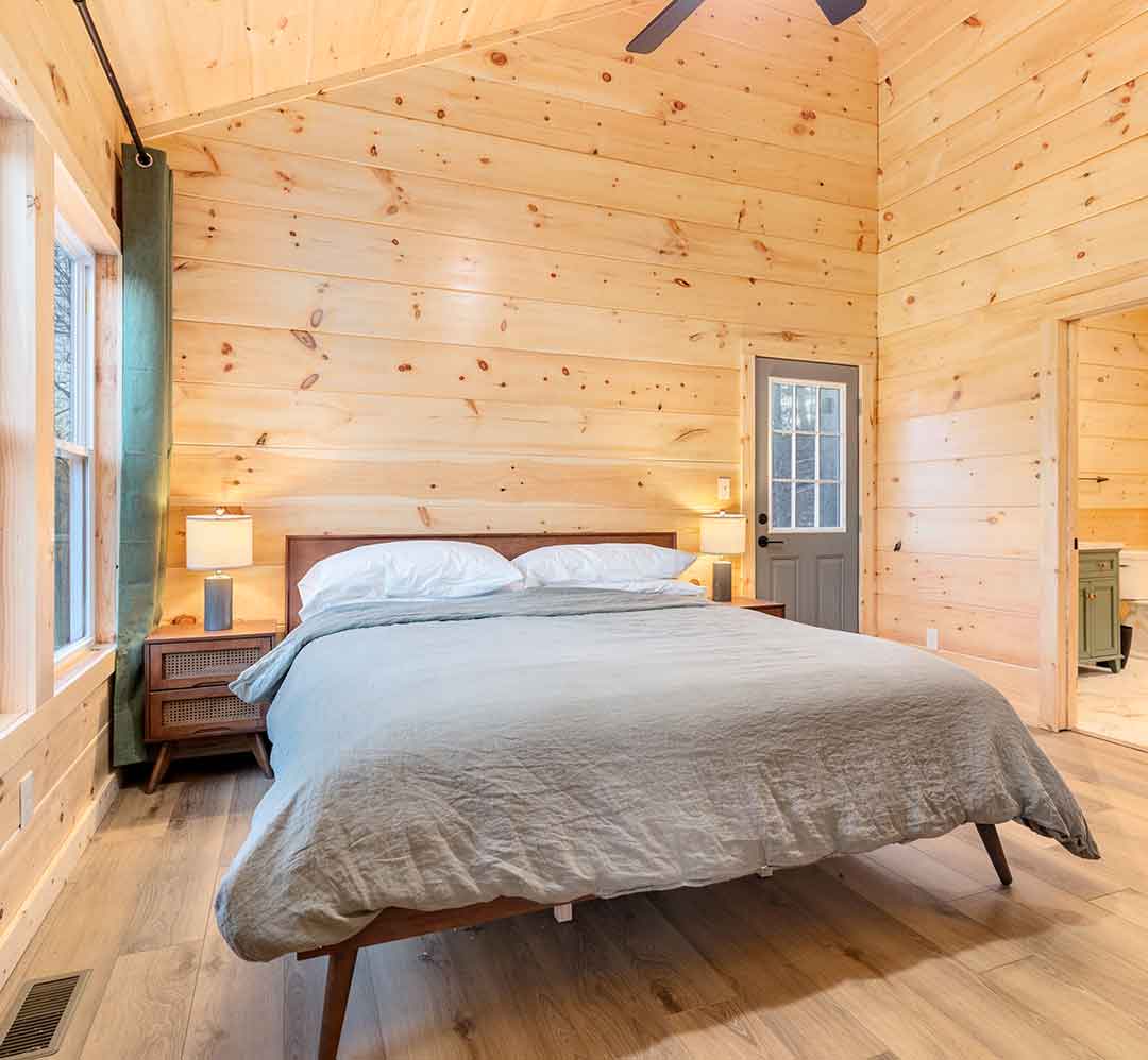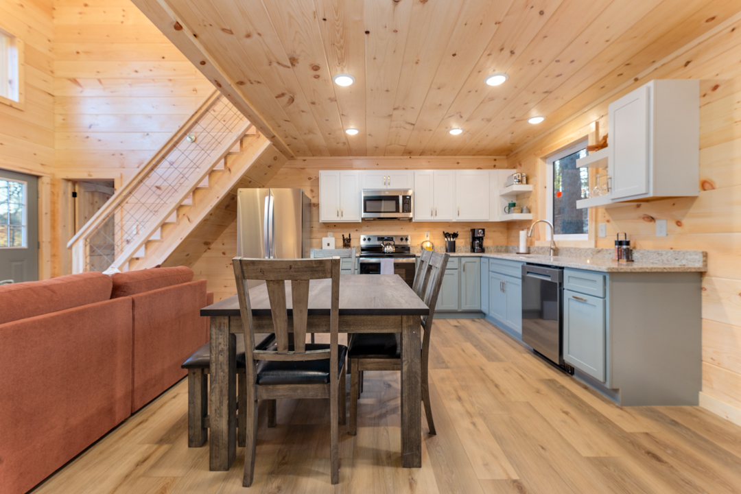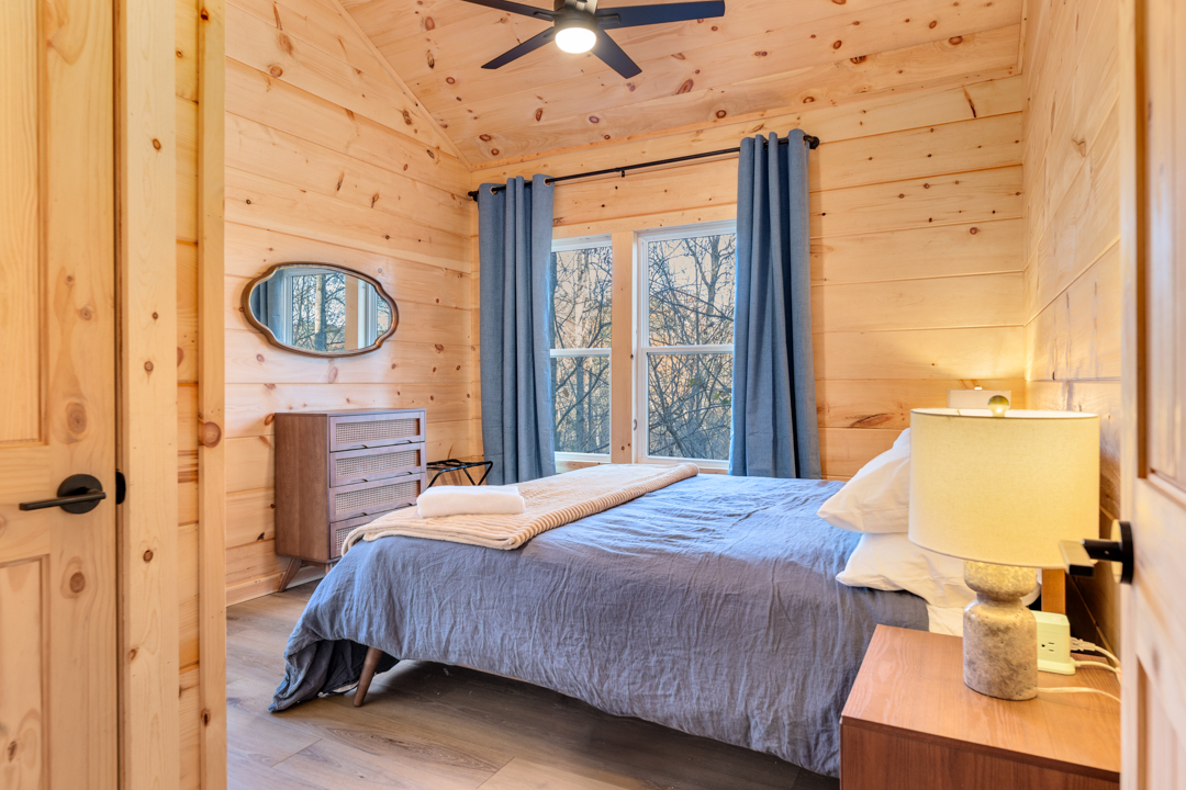 Skyward Chalet blends modern rustic style with the natural beauty of Red River Gorge. Inside, you’ll find warm wood finishes, aviation-inspired touches, and plenty of space to unwind. Both bedrooms feature king beds, the loft adds a cozy queen, and the main bathroom elevates your stay with a large tiled shower featuring both a standard and rainfall showerhead.
