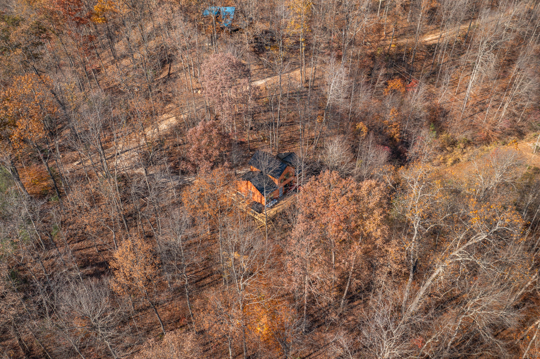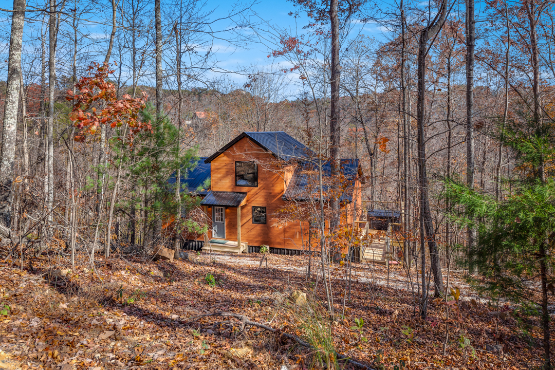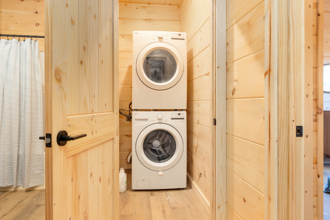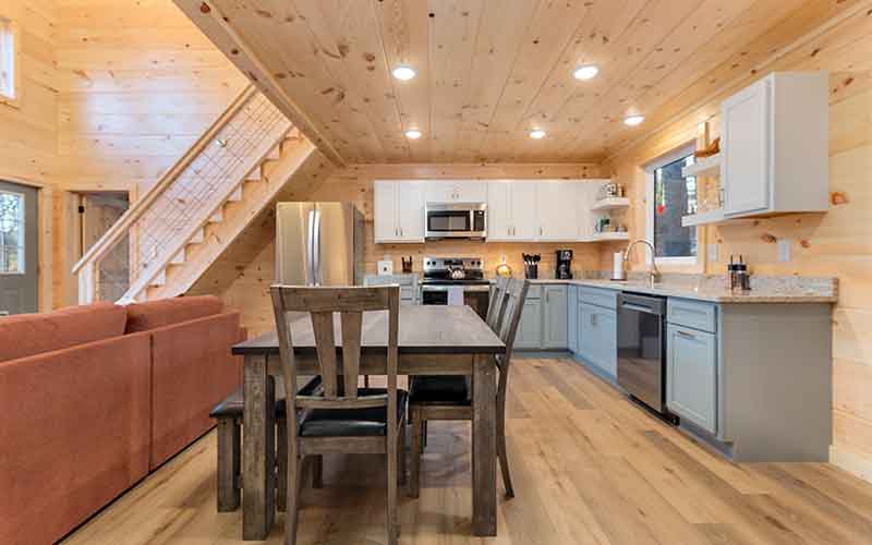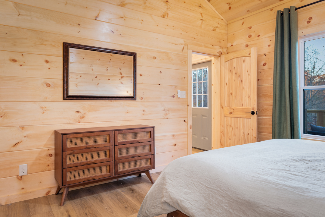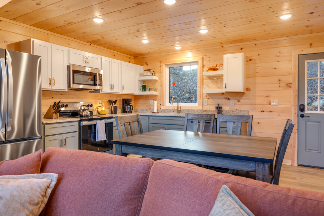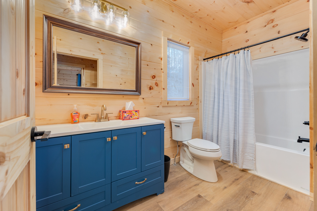 Skyward Chalet blends modern rustic style with the natural beauty of Red River Gorge. Inside, you’ll find warm wood finishes, aviation-inspired touches, and plenty of space to unwind. Both bedrooms feature king beds, the loft adds a cozy queen, and the main bathroom elevates your stay with a large tiled shower featuring both a standard and rainfall showerhead.