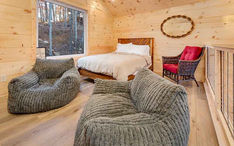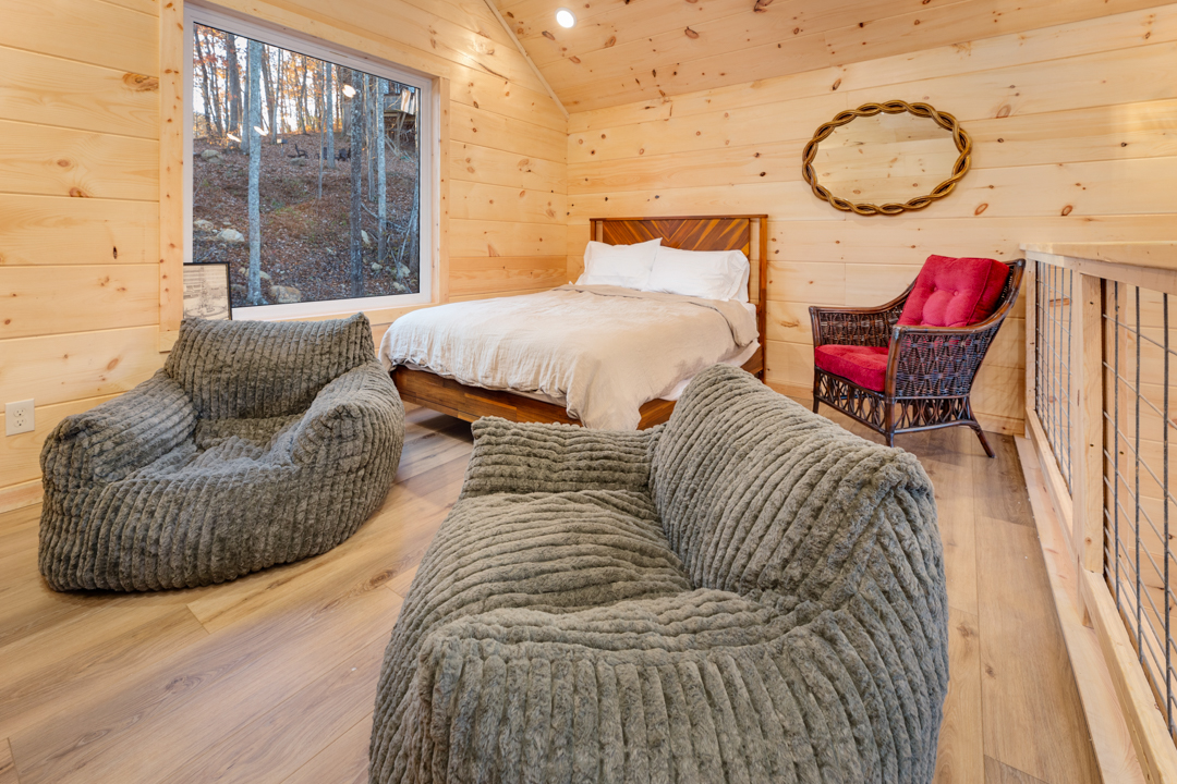 The open loft provides additional sleeping space with a cozy queen-size bed, ideal for extra guests or kids.
